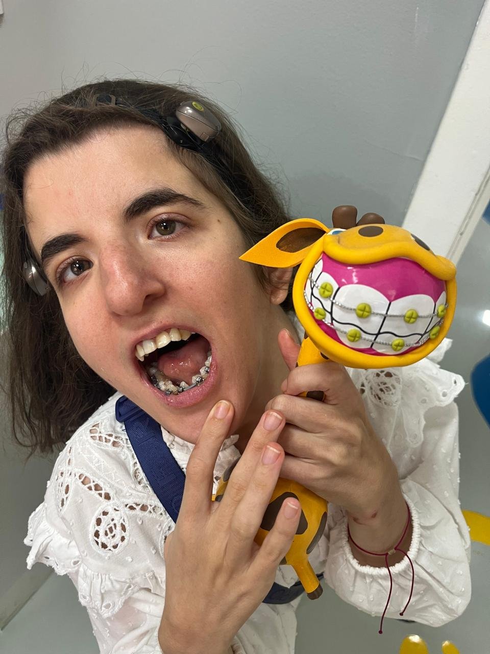Mas sabem o que mais me animou? No meio da consulta, eu encontrei uma girafinha de brinquedo muito charmosa. E não é que ela também usava aparelho? Ela tinha pecinhas em cima e embaixo, igualzinho a mim! Ver que a minha amiga girafa também era corajosa me deixou muito feliz.